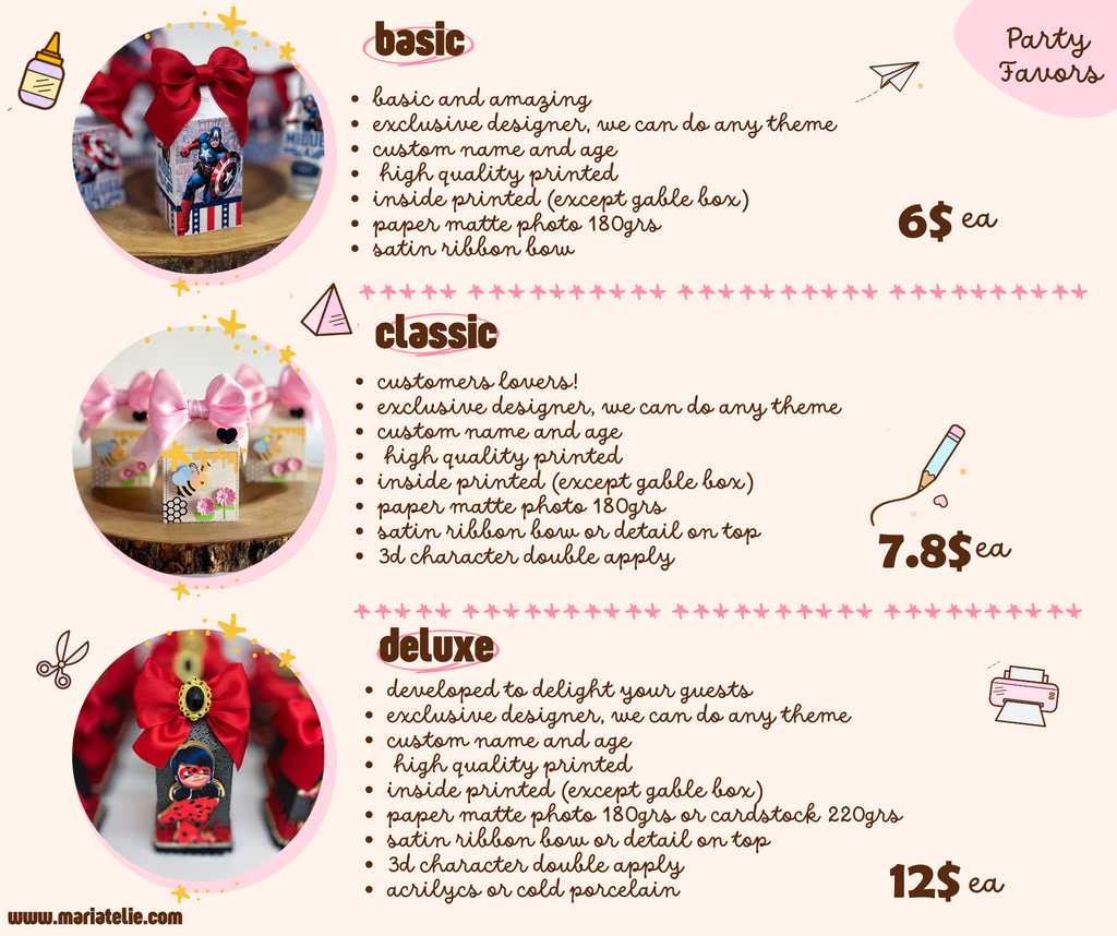 This favors box will give a special charm to your party. This designer was created for you to have a beautiful and exclusive product at your party.